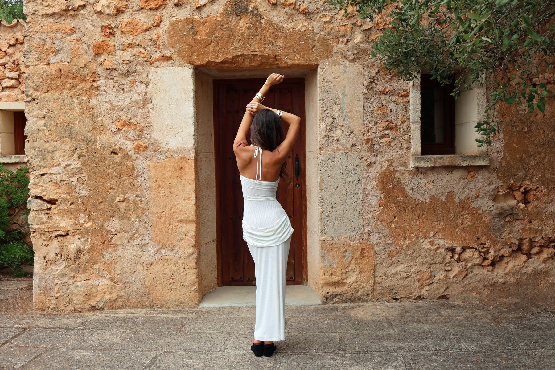 A fresh take on warm-weather dressing. This halter maxi is crafted from breathable soft-mesh with a built-in bikini-style top that offers gentle support. Designed with ruching through the waist to create a smooth, hourglass shape, the skirt drapes cleanly to the ankle with an effortless, elongated finish. Light, airy, and endlessly flattering — the ultimate vacation dress.
