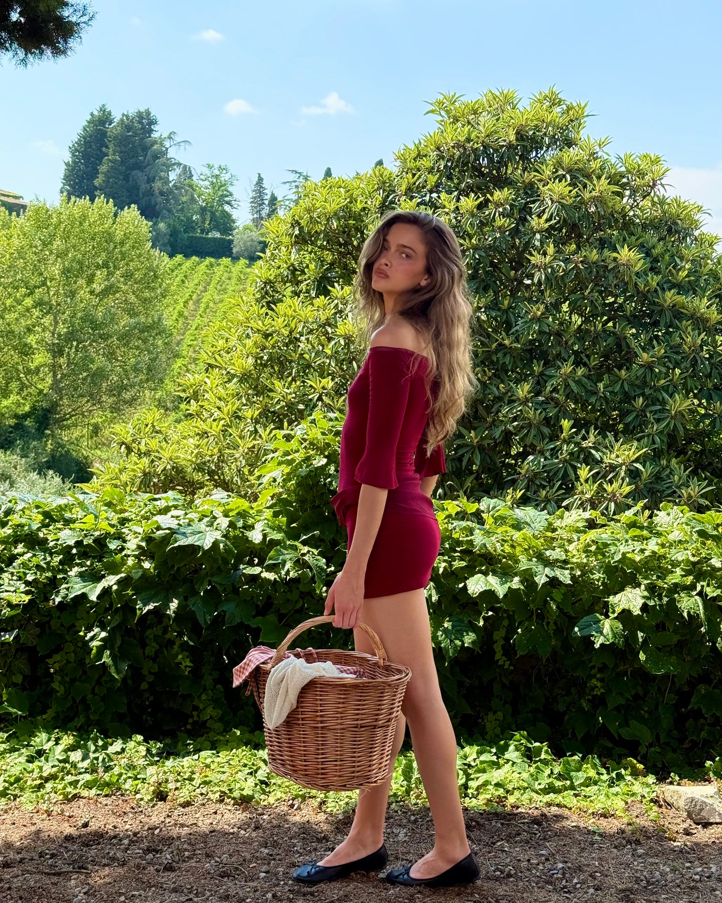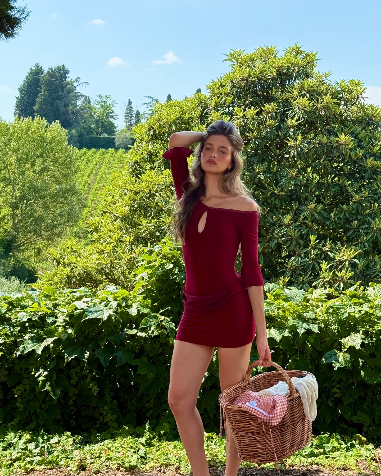 The Isla Dress features an off-shoulder neckline, subtle keyhole detail, and soft flared sleeves that feel effortlessly romantic. Its rich red hue and feminine draping create a warm, holiday mood—perfect for Christmas dinners, winter getaways, or golden afternoons.