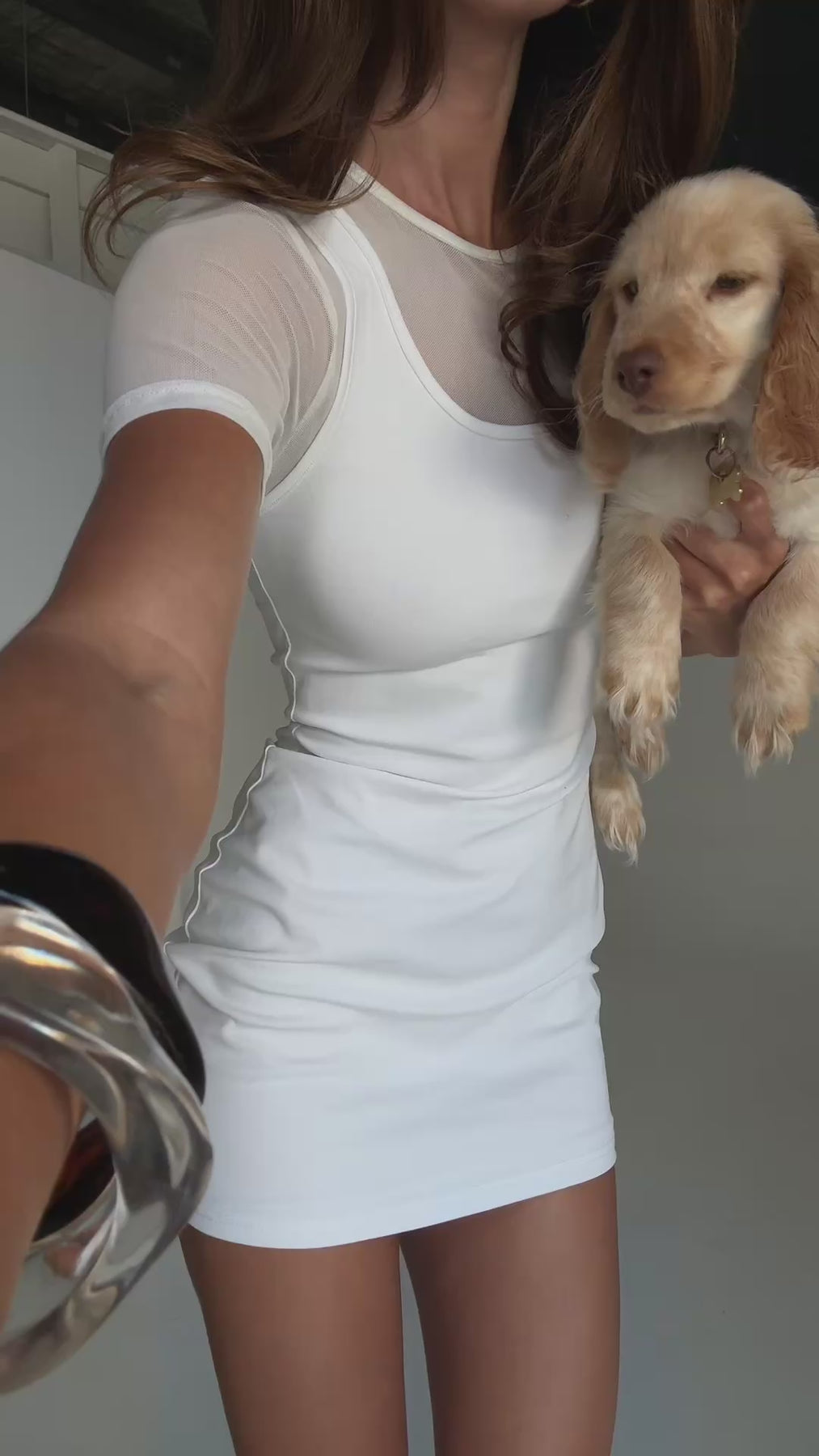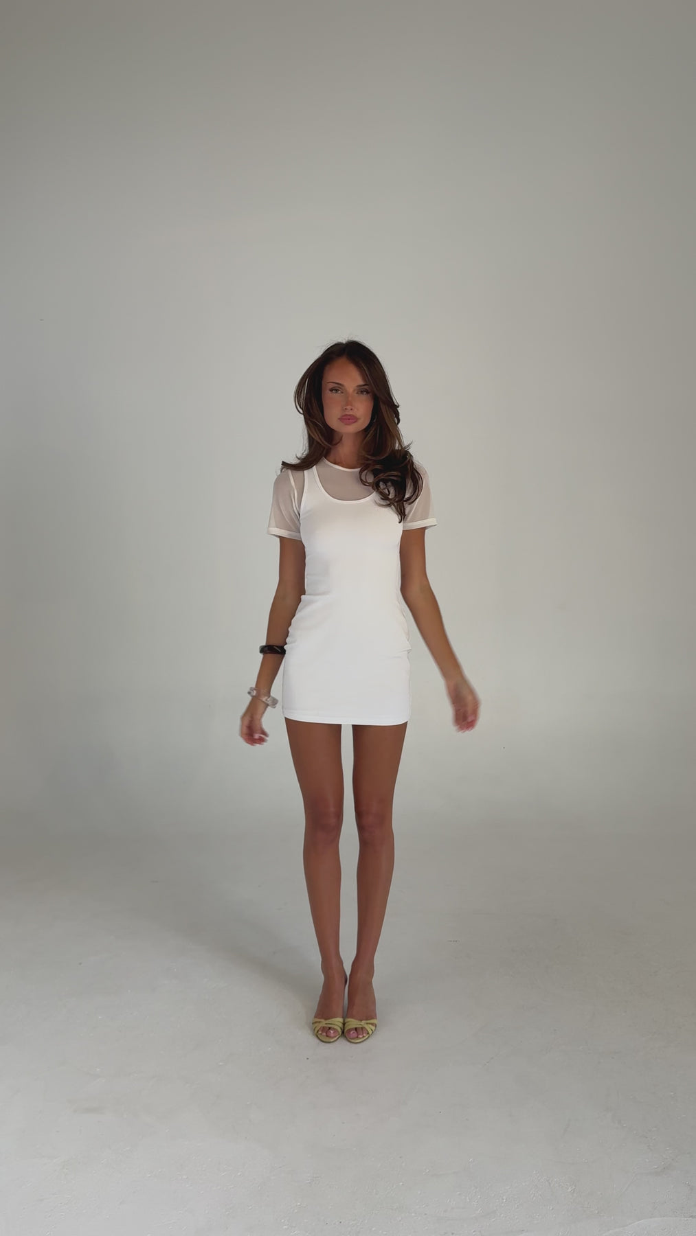 Designed in a soft, ribbed fabrication, this piece features a figure-hugging silhouette that contours the body while remaining comfortable and breathable. The layered look — combining a sheer short sleeve overlay with a classic tank-style base — adds dimension while keeping the aesthetic minimal and clean.